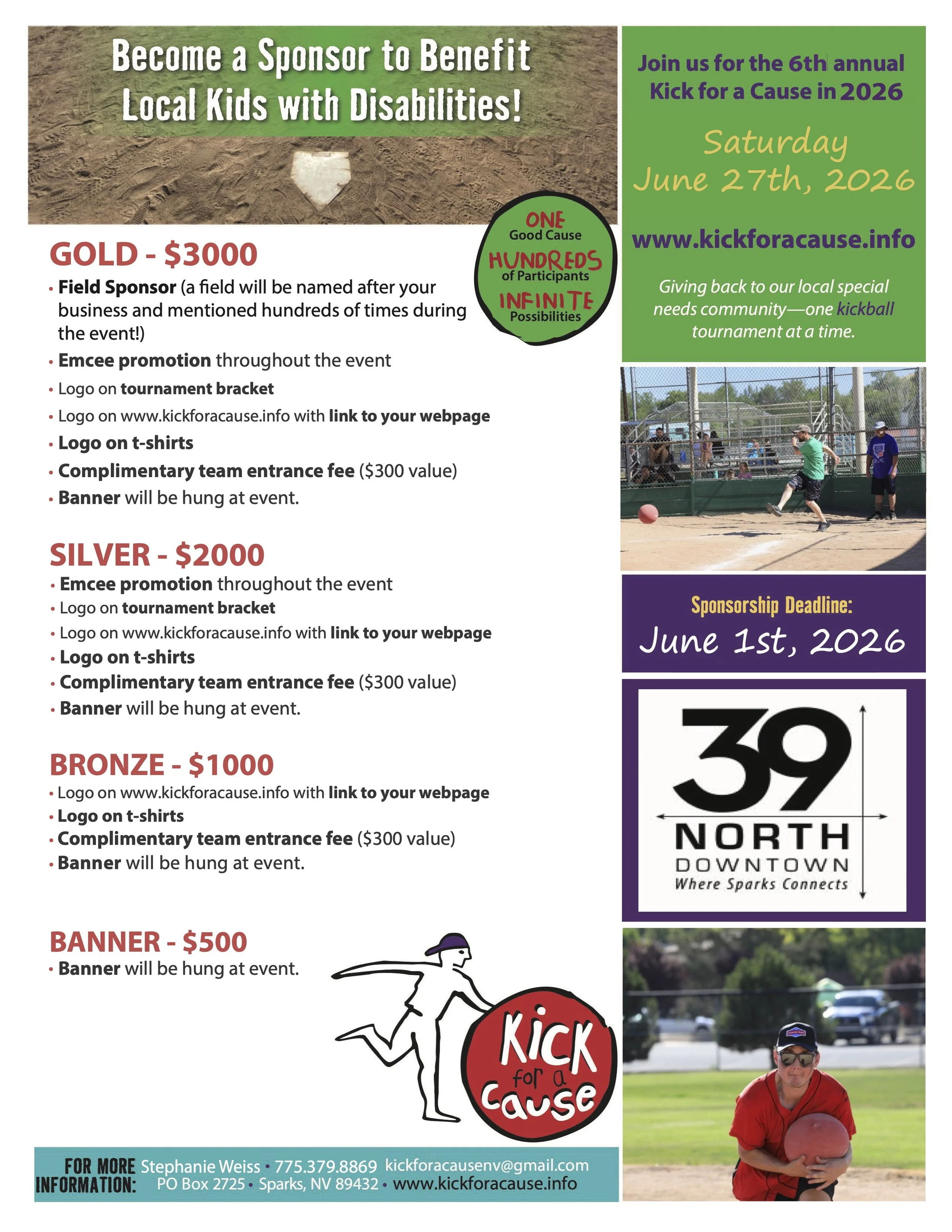 For more information on how to sponsor the Kick for a Cause Kickball tournament to help children in our community of different abilities, please send a message of inquiry to KickForACauseNV@gmail.com